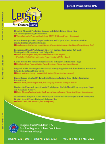 Ecoprint: alternatif pendidikan karakter pada pokok bahasan kimia hijau dan pembangunan yang berkelanjutan. Konsep kimia hijau (Green Chemistry) dan pembangunan yang berkelanjutan (Sustainable Development Goals), adalah salah satu pokok bahasan yang tercakup dalam Capaian Pembelajaran (CP) kimia fase E. Nilai karakter yang diharapkan pada pokok bahasan konsep kimia hijau (Green Chemistry) dan pembangunan yang berkelanjutan (Sustainable Development Goals) adalah agar peserta didik dapat mengaplikasikan konsep kimia dalam kehidupan sehari-hari sehingga berdampak pada karakter cinta lingkungan, meningkatkan hasil belajar dengan memanfaatkan bahan alam (kearifan lokal), memanfaatkan limbah menjadi barang-barang yang lebih berdayaguna dan bernilaiguna. Tujuan penelitian adalah menjadikan pembuatan ecoprint menjadi salah satu alternatif model pembelajaran berbasis projek dalam penerapan Kurikulum Merdeka, serta menerapkan pendidikan karakter khususnya pada bidang studi kimia. Penelitian merupakan hasil praktik baik (best practice), dengan metode deskriptif kualitatif. Data disajikan dalam bentuk deskriptif didukung oleh literasi dari studi pustaka. Hasil rata-rata pendidikan karakter adalah 83 (baik), dan hasil rata-rata produk ecoprint yang dihasilkan adalah 93 (sangat baik). Hasil penilaian menunjukkan bahwa praktek pembuatan ecoprint dapat menghasilkan karakter yang baik dan kualitas . Simpulannya projek pembuatan ecoprint dalam mata pelajaran kimia dapat meningkatkan motivasi peserta didik untuk menghasilkan karya yang lebih baik, namun tetap memperhatikan permasahan lingkungan hidup dengan penggunaan bahan-bahan yang ramah lingkungan.